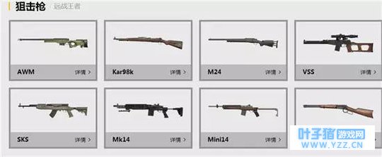 UZI、汤姆逊、UMP9、Vecrot,这四把都是很好捡到的武器,而且这个武器的伤害都是可以的,只有子弹比较少,冲锋枪射速都是非常快的,这四把非常好排名。UMP9>汤姆逊>UZI>Vector,这武器就是冲锋枪了,适合是近战使用,不过冲锋缺点也比较明显,除非你很会用,不然直接拣一把步枪要好于冲锋枪的。 狙击枪介绍: