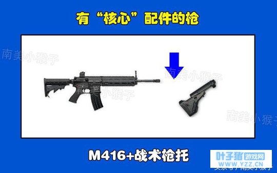 3、M416-战术枪托, 在刺激战场中,M416的核心就是枪屁股,作为四个赛季最强的一把突击步枪,M416一直占据着枪械的王牌宝座。但是有没有枪屁股的M416用起来是真的不一样,不少玩家认为如果整局都没M416枪屁股,还不如用别的步枪,这个说法确实是有道理的,战术枪托这个东西虽然看着是个小配件,但是在M416身上,就是一个核心大配件了!要是少了它,后坐力会大很多,不如用AKM。