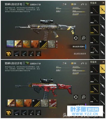 “斯嘎”——血誓、黄色极简讲道理,“斯嘎”的人气丝毫不比其他步枪低哪里去,凭借较少的配件,快速稳定的杀伤,很多玩家都非常喜欢!而“斯嘎”的皮肤中,L尤为喜欢红色的“血誓”,虽然极有可能因这件皮肤“曝光”自己的位置,但外形实在是让人难以拒绝~而“黄色极简”这种皮肤呢,也是非常低调但大气,不那么“扎眼”,但依然有自己的特色!