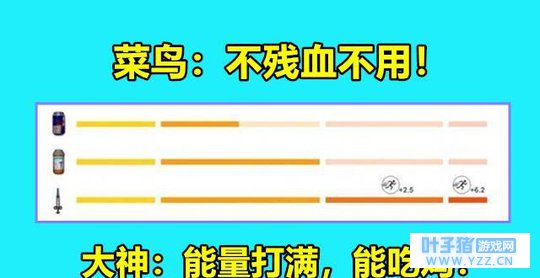 2:决赛圈打满能量。在绝地求生游戏中,能量条的作用,我相信至今还被某些玩家所忽略,能量条不仅能让玩家缓慢回血,还可以提高移动速度,所以在后期步行的时候,只有补满能量,速度提升了,才容易早点进圈。在决赛圈中,大神通常会用背包的补给打满能量条,而菜鸟经常为了节省药品,在血满的情况下,不会这样做。但是能量条最大的作用,其实是让我们拼抢的时候,靠着回血效果丝血反杀,并且跑毒转移更快,所以大神从不省药,有就打满。