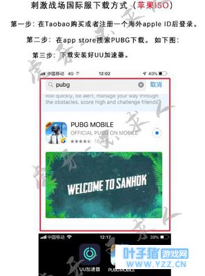 对了以上的是安卓的下载方式,接下来看下iOS是怎么下载的!首先我们在淘宝购买一个或者注册一个海外的APPLE ID后登入,然后在app store中搜索pubg,然后在安装好UU加速器!然后UU加速,进行下载!