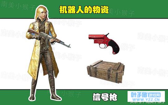 3、信号枪, 作为刺激战场玩家最想得到的一把枪,信号枪的最大功能就是可以召唤超级空投。而捡一个超级空投,基本可以满配了。可能很多人惊讶,信号枪也能刷在机器人上?没错,这个可能真的是万年难遇了,小猴子就遇到过一把。 要知道光子再上个版本已经更新了机器人的各类性能, 最重点的是,机器人已经开始会去舔包了。 可能那次小猴子碰到的机器人,正是舔了别的玩家包里面带的信号枪!这运气真的是没谁了。