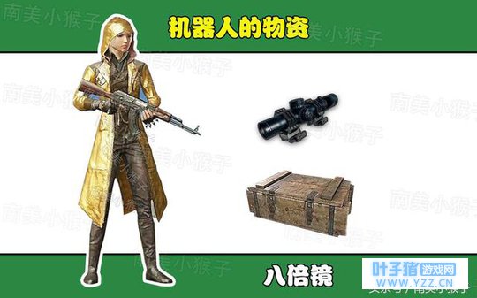 2、8倍镜, 刺激战场的地图非常大,如果说你在远距离遇敌的话,没有一个高倍镜,那就处于非常大劣势了。在刺激战场中,击杀的电脑人盒子里,能捡到一个八倍镜也是非常的罕见的,不过如果你平时只用突击步枪,又或者身上并没有带狙击的话,八倍镜就变成了鸡肋。因为自前几个版本更新后,八倍镜早已不能装在步枪上了。
