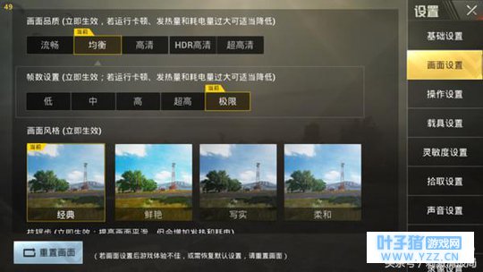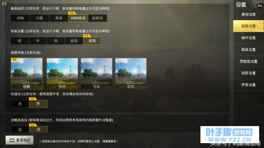 游戏本或游戏台式机的性能对于手游版的刺激战场来说,已经非常够用了,在游戏内置的分辨率当中都会自动默认为1080P及以上。在游戏的画面设置当中,设置为画面品质 HDR高清 、帧数设置 极限 、画面风格 经典 。