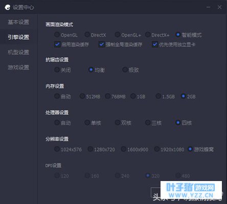 并在设置中心当中选择 引擎设置 ,并根据下图的配置进行选择。