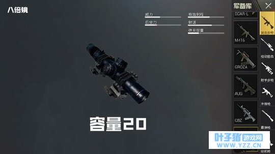 如果是在端游里面,托腮板确实是一件非常好用的道具,装上15倍镜必须要用有托腮板才能彰显出狙击枪的魅力。可是手游的倍镜最高也就是8倍,并且手机的屏幕太小,在400米以外的敌人配上八倍镜都很难看得清楚。就算有没有托腮板都好,基本上都是很难瞄准敌人的。而最尴尬的是托腮板在手游里面是最垃圾的道具,有没有这个配件效果几乎一样! TOP4、八倍镜(容量20)