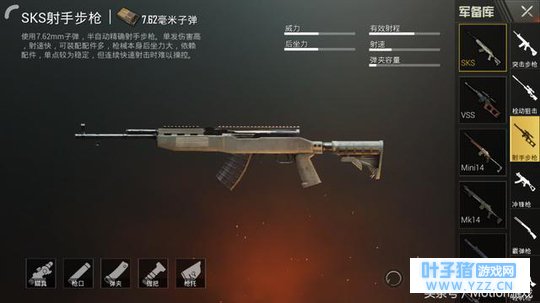 【SKS射手步枪】常用射手步枪SKS,经常用的连狙,现在可以用步枪的扩容,不加扩容10发子弹不够用,增加扩容还是一把非常实用的连狙,增加了很多的容错率,多排有人倒地可以直接补掉敌人,伤害比较高,常用连狙的最佳之一。SKS还可以装配很多配件,满配的时候枪口抖动很小,没有配件的时候就有些乏力。
