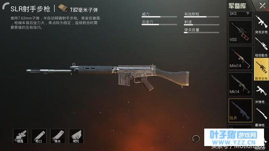 【SLR射手步枪】SLR是后面增加的射手步枪,只能安装扩容和枪口,使用起来是非常方便,落地比较穷的地方SLR优先级更高。SLR使用是枪声不是很大,抖动也比较一般,连狙中这把枪还是非常容易操作的,面对众多敌人,扩容一梭子弹全倒地,操作比较简单,而且性价比非常好,我就比较喜欢SLR,SKS落地以后很少会用,八倍镜的抖动太大,SLR用起来就不会有太多抖动感。