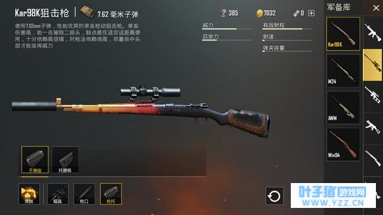这把出自德国的名枪伴随着绝地求生一路大火,不管是不是,吃鸡玩家们只要看到栓动步枪都会大喊一声98K。98K作为地图中刷新的物资,一枪打爆二级头不在话下,自然吸引了玩家们的热爱,值得一提的是,单发狙枪口首推消音器,其次消焰器,而补偿器对单发狙来说毫无用处。98K的配件唯一值得争议的是枪屁股,托腮板还是子弹袋一直争论不休。其实在端游里,托腮板的作用要比子弹袋大一些,因为它能减小开镜后的准星晃动,而手游中开镜是一点都不晃的,所以首推子弹袋。 关于最强吃鸡神装,那位吃鸡率高达百分之五点三的大神的装备是这样的,三级套自然不必多说,步枪的话,红点+补偿器+垂直握把+快扩+枪托M4,高倍镜+补偿器+垂直/轻型握把+快扩+托腮板SKS。 单发狙对于移动靶需要很强的预判能力和运气,打趴着不动的敌人自然很轻松,若是敌人是个多动症,那就头疼了,而连狙的容错率就很高了,大不了一枪不中再来一枪,最重要的是,那位大神有SKS皮肤……