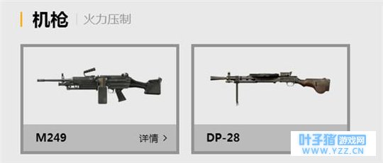 UZI、汤姆逊、UMP9、Vecrot,这四把都是很好捡到的武器,而且这个武器的伤害都是可以的,只有子弹比较少,冲锋枪射速都是非常快的,这四把非常好排名。UMP9>汤姆逊>UZI>Vector,这武器就是冲锋枪了,适合是近战使用,不过冲锋缺点也比较明显,除非你很会用,不然直接拣一把步枪要好于冲锋枪的。 机枪介绍 :