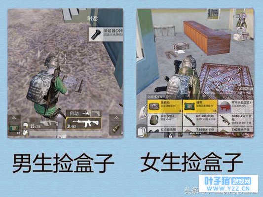 男生刚枪的时候喜欢和敌人硬怼,仗着自己技术好在队友面前大秀枪法,什么提前枪,瞬狙,闪身,回流,拜佛枪法样样精通,经常凭一己之力拯救队伍于危难之中,人人争做刚枪王。 女生刚枪的时候喜欢站桩输出或是立即趴下,以为自己趴在草丛中敌人就看不到自己了,听着附近劈里啪啦的枪声瑟瑟发抖。团战才刚刚爆发,我们就能听到队伍里的女生大喊一声:哎呀我被击倒了。 4.捡盒子: