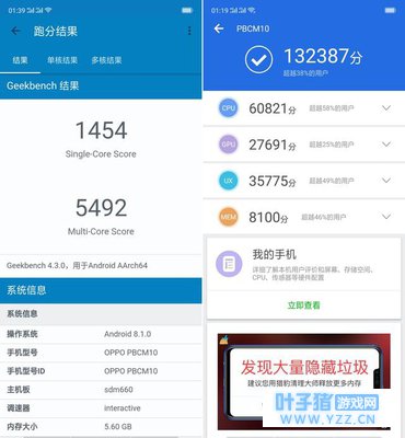 性能也是OPPO R15x的强项,搭载了高通骁龙660处理器,这颗14nm工艺打造的处理器在去年可是旗舰机的最爱,在经过GeekBench 4进行测试后单核得分1454,多核5492,安兔兔得分也在13万,绝对的一代神U。如今被用在中端机身上,再辅以6GB+128GB内存组合,性能与流畅度都没有任何问题,同时OPPO R15x还支持智能场景识别功能,最让用户的游戏体验更高,吃鸡开黑更轻松。