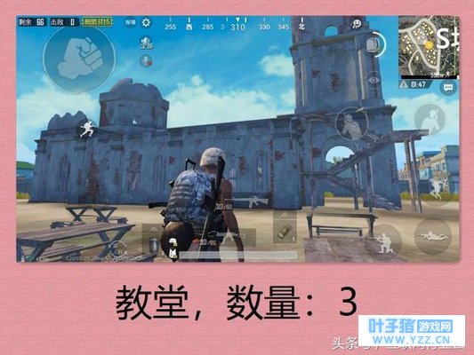 教堂建筑由于其显著的外形即便是新手也能一眼认出,虽然较为稀有仅有3处,物资等级却要高于许多建筑,常刷新4倍镜,急救包,三级头与SKS等装备。教堂建筑最典型的代表当属P城教堂,在拥有高倍镜狙击枪之后可以从这里为城区的队友提供报点及火力压制,对于玩家意义重大,同样的教堂也分布于Y城和S城。