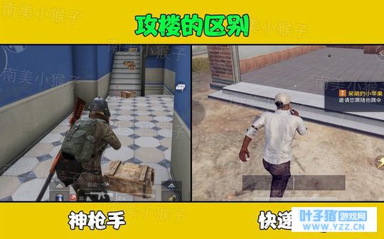 二、攻楼的区别, 绝地求生刺激战场中,神枪手攻楼一般都是有套路的,首先先一顿手雷燃烧瓶乱丢,淘汰他们就省事了,如果没有淘汰,听到敌人正在打药包立马攻楼,而且第一时间就切换第一人称视角冲楼,可能很多玩家不知道,攻楼第一时间比第三视角好太多了。但是快递员不一样,即使包里10个手雷,听到楼上有脚步也就直接冲上去了,这样上去敌人大多都有准备了,卡视角等着你上来送呢!