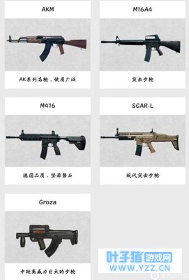 步枪是绝大部分人选择的主枪,当然,很多不喜欢用狙的人副枪也是步枪。所以重点介绍下 762枪 AK,伤害贼高,枪贼跳,不容易压枪,甚至根本压不住,适合近身战。在没有狙的情况下可以配高倍镜单点当狙使。 狗杂,射速贼快的762枪,因为是762子弹,所以伤害可观,对得起空投枪的地位。 556枪(伤害都一样,射速也差不是很多,就是特性和配件的差别) 16,很多人不喜欢但没有其他556枪时又很抢手的鸡肋枪。其实,这把枪还可以,很多人不喜欢是从众心理,和它三连发的影响,但事实上在都没有配件时它比其他556枪都稳。 M4,最受欢迎的枪,没有之一!这个不是从众心理,可以自己去训练场试,满配M4真的强,但是注意不是满配的M4并不强,至少我个人觉得比较抖,所以不要一味迷信M4,还是要把配件捡齐才行 249(大菠萝),空投枪,一个弹夹100发556子弹,贼抖,扫车还行毕竟子弹多,完全对不起空投枪的地位,开到就哭吧 2.狙击枪