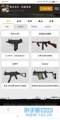 维克托,13发子弹,极高射速,爆发力强,近战强但容错率低 UZI(乌兹)25发子弹,极高射速,爆发力强,近战很强 汤姆逊,很少人捡,略 UMP9,可替代步枪的的冲锋枪,有很多的粉丝,就是射程短,射速快,稳定性强,很适合扫车 配件 枪口