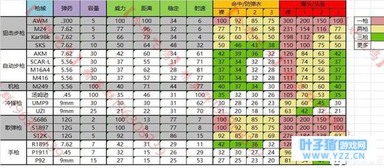 首先,看一下枪械伤害,见下表,是网上转载的,很详细,有耐心的可以仔细研究,没耐心的就听我简单BB一番吧。