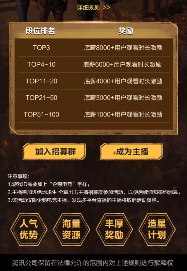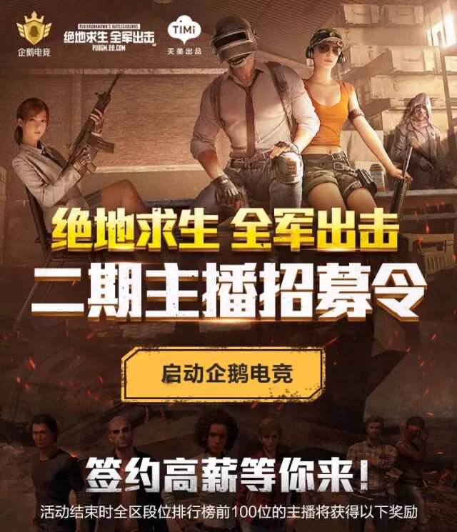 企鹅电竞 《绝地求生 全军出击》 主播招募活动第二期 现已全面开启!顶级品质游戏,千万现金奖励,为你的直播梦想保驾护航!