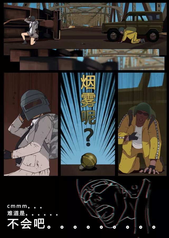 在堵桥的时候,双排 大腿沉迷对枪 不能自拔,在漫画小妹用十块钱耳麦的魔音指挥下,成功被敌人击倒.......