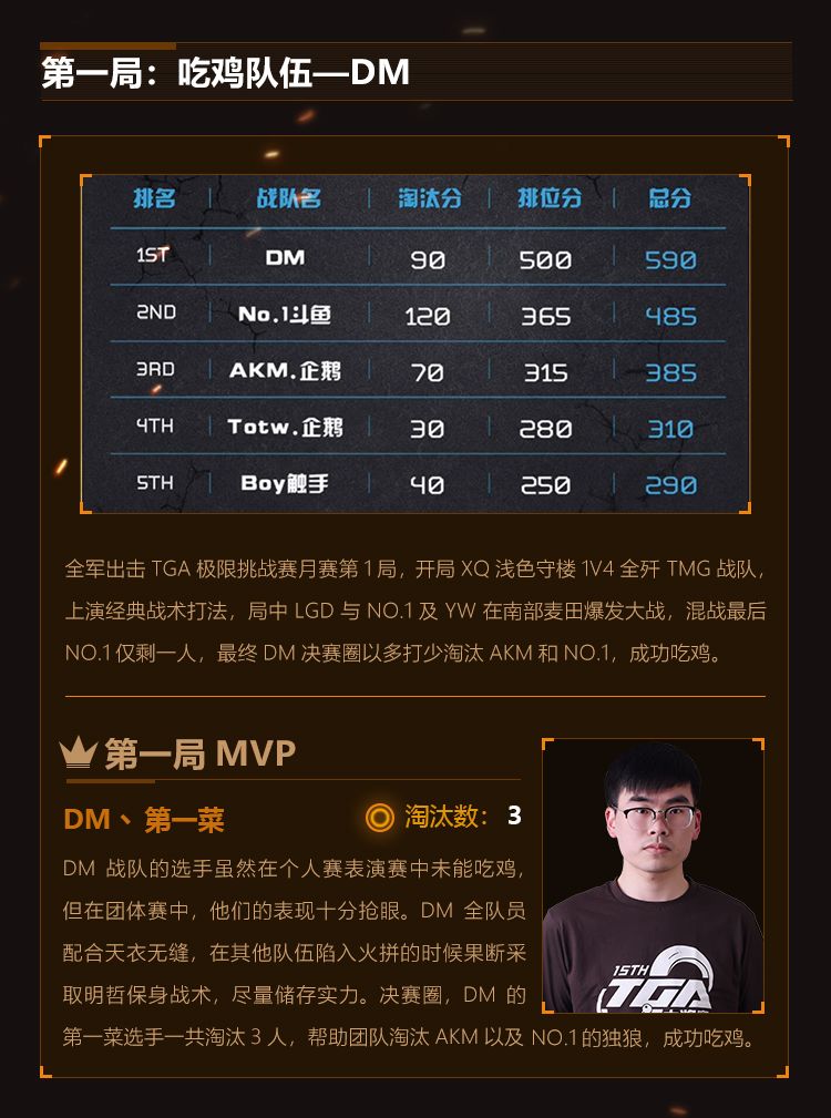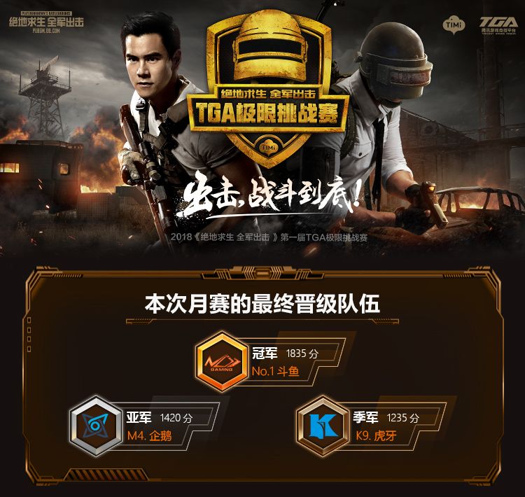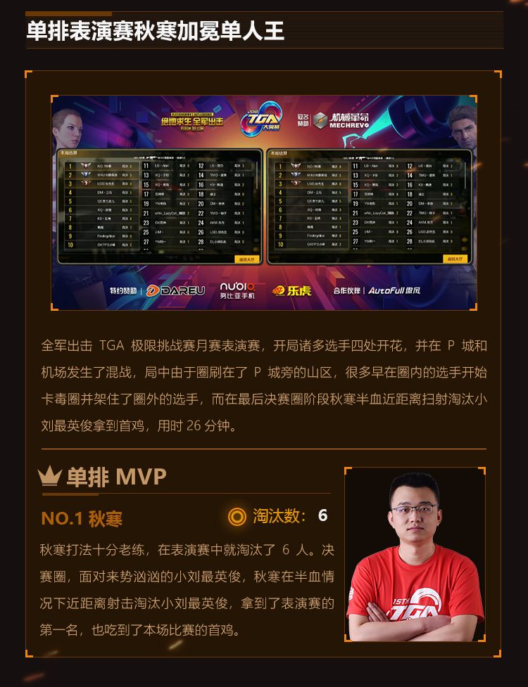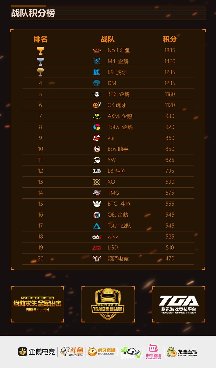 最后恭喜 NO.1斗鱼、M4企鹅、DM、K9虎牙 获得积分前三,以及 NO.1秋寒 获得单排表演赛第一名! 没有进入排名榜的队伍也请继续努力,希望选手们在未来继续为击友们带来更加精彩的比赛!
