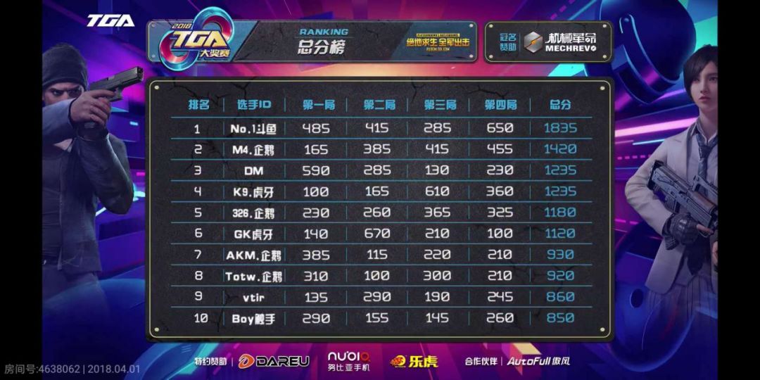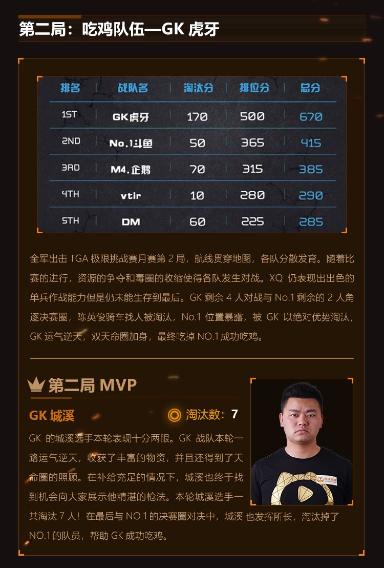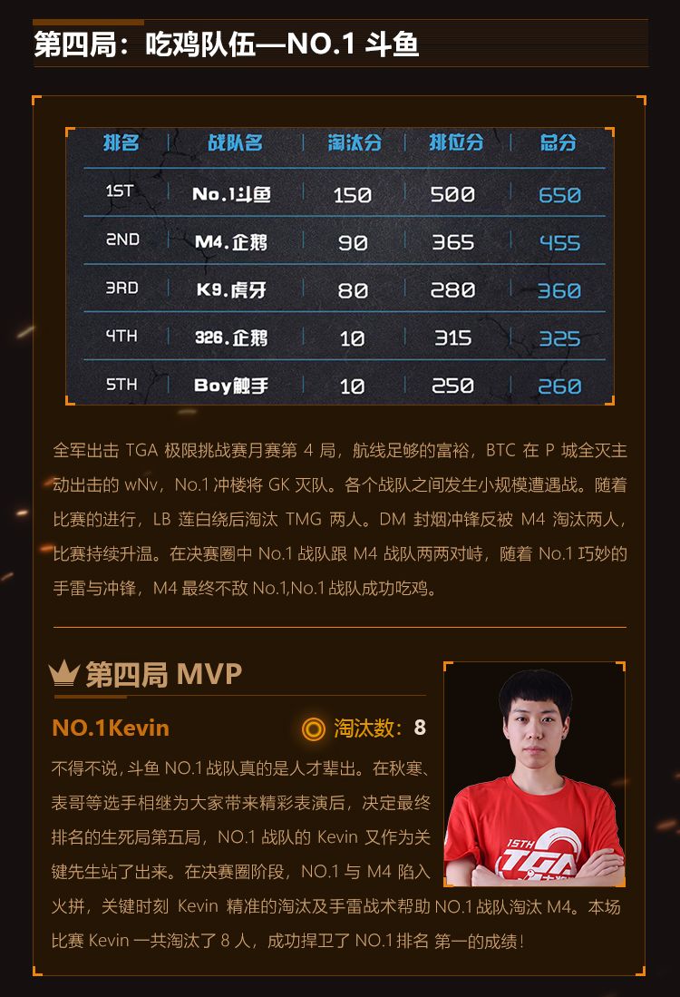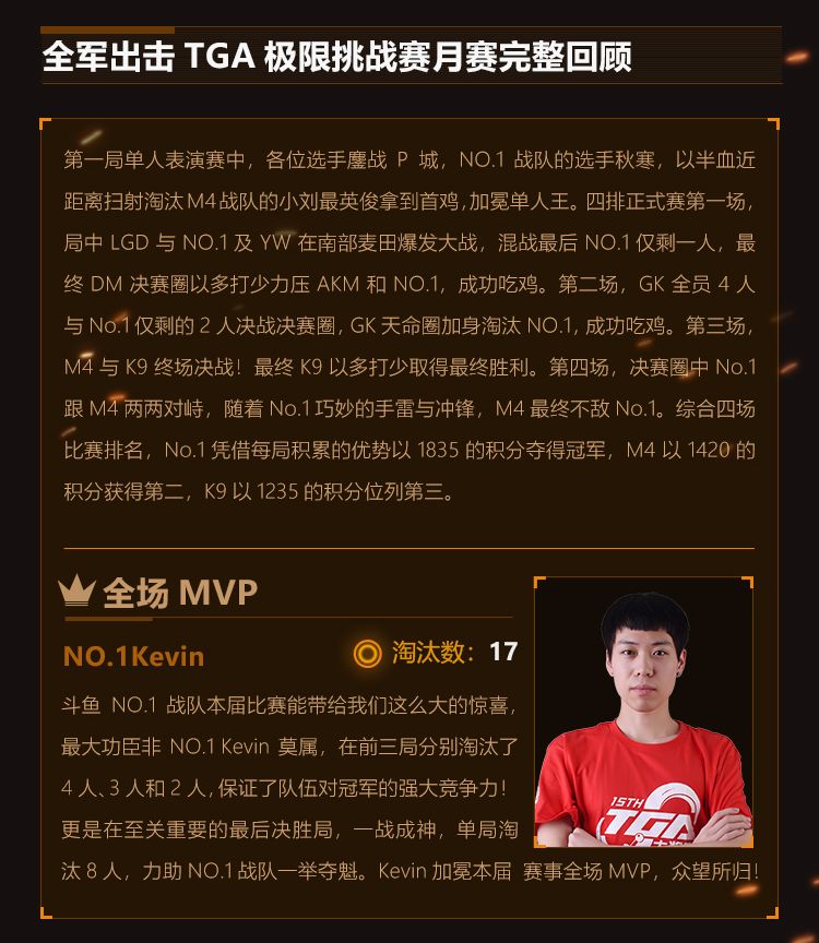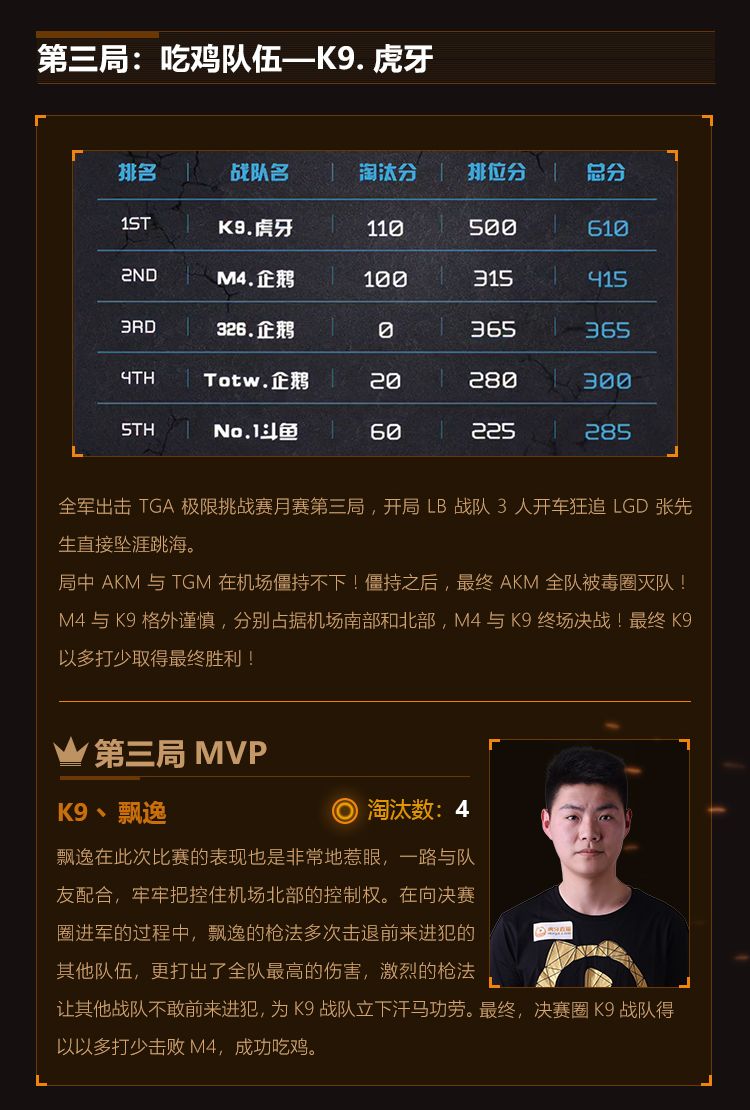 最后恭喜 NO.1斗鱼、M4企鹅、DM、K9虎牙 获得积分前三,以及 NO.1秋寒 获得单排表演赛第一名! 没有进入排名榜的队伍也请继续努力,希望选手们在未来继续为击友们带来更加精彩的比赛!