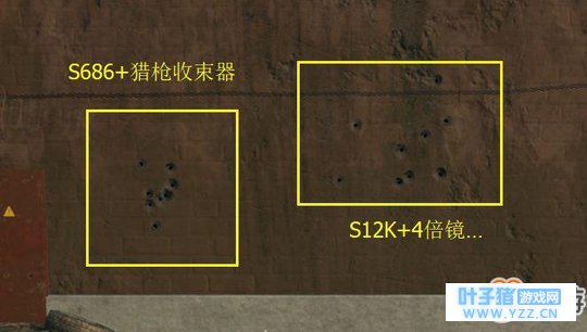 三把枪的归零距离都是25m,上图是30m左右的S686弹道测试,左侧是没有装填配件的弹道,右侧是装填了猎枪收束器的弹道。 猎枪收束器作用: 减少18.2%弹丸扩散 增加15.4%弹丸速度 子弹带效果: 减少30%子弹装填时间 这也是为什么很多朋友惊呼自己满血被敌人50m一喷子撂倒的原因,装填了猎枪收束器的喷子能够命中40m-50m的目标同时约束子弹的扩散范围。
