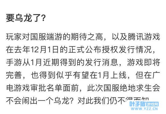 1月5日广电总局,发出游戏审批名单,里面并不包括绝地求生。而腾讯的两款手游是由绝地求生衍生而来的,如果绝地求生不出,刺激战场和全军出击也只能胎死腹中。小编猜测,如果腾讯无法解决这个难题,继续拖下去,可能网友还没等到公测,游戏就凉透了。 |