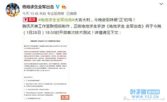 官方微博 在PC端《绝地求生》上线之前,腾讯推出这款手游的目的何在?目前看来腾讯只是想抓住更多的玩家群体在自己手里,本来腾讯宣布代理之后,不少玩家就表示,游戏是否会变成人民币游戏,运营能否做好。如今腾讯突入吃鸡手游市场,对其他商家也是由一定的影响的,是否因为腾讯代理的《绝地求生》而导致玩家支持正版官方手游。《小米枪战》和《荒野行动》的玩家是否会转移吃鸡战场。