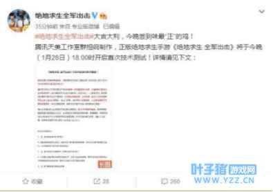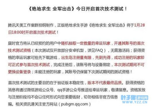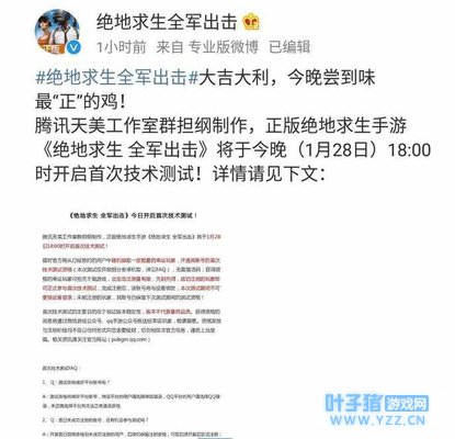 《绝地求生:全军出击》大吉大利,官方最新公布!今晚尝到味最“正”的鸡!腾讯天美工作室群担纲制作,正版绝地求生手游《绝地求生 全军出击》将于今晚(1月28日)18:00时开启首次技术测试!详情请见下文: