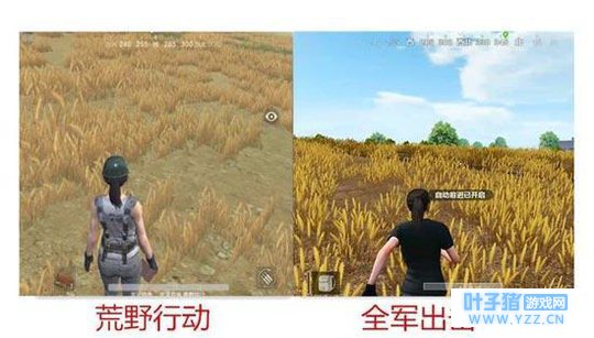 【平原植被效果】 我们通过截图可以看到,《绝地求生全军出击》对植被效果很重视,从麦田、草丛深浅不一的层次感,再到平原地形丰富的色彩效果,都使整体画面更加逼真。而《荒野行动》草丛分布则过于松散,且由于没有光影效果处理,颜色过于单一虚假,不利于玩家伏地隐藏自己。