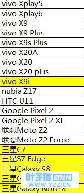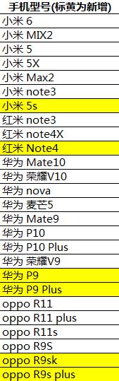 首次技术测试机型列表(标黄为新增机型)