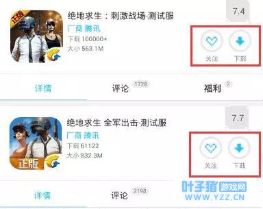 ⑶ 进入绝地求生:刺激战场和绝地求生 全军出击页面后点击下载和关注,即可下载正版绝地求生手游,并且在9日正式开测后第一时间收到开测通知!