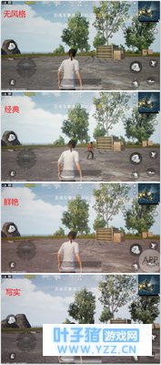 《绝地求生:刺激战场》的色彩风格则相对清新一些,画面比较明亮,光影效果也更好一些。和《全军出击》类似,《刺激战场》也提供了多种画面模式,有「经典」、「鲜艳」、「写实」和「无风格」四种可选。