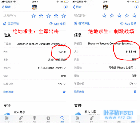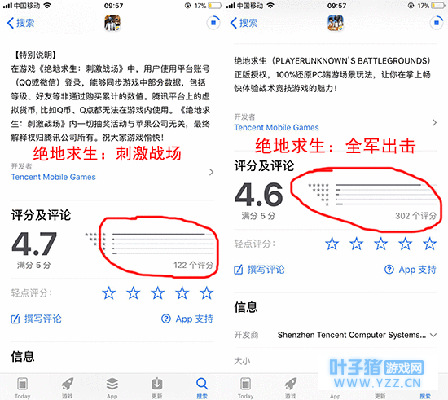 那么,《绝地求生:全军出击》和《绝地求生:刺激战场》之间应该如何选择呢?通过App Store上的一些介绍,我们发现了一些颇为有意思的事情。两款游戏都采用了虚幻4擎研发,但是,《绝地求生:全军出击》的游戏包体达到了1.3G,而《绝地求生:刺激战场》的游戏包体仅有843MB。而游戏刚刚上线没多久,《绝地求生:全军出击》便收到了302个评分,而《绝地求生:刺激战场》仅有122个评分。但在好评率上,《绝地求生:刺激战场》相对更高。