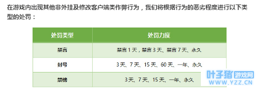 根据企鹅游戏安全中心公布的处罚规则显示,玩家只要开挂就将会被封号,而且只有三个梯度,分别是60天、一年、和永久。而对其他非外挂及修改客户端类的作弊行为,处罚力度就小很多,大部分是禁言、禁版,即使封号也有6个梯度可供选择。
