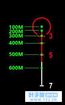 100米时,人物高度大于红色箭头:把箭头最顶端的位置瞄准敌人的头部,可一枪爆头; 200米时,人物高度等同红色箭头:点和线之间(绿色点)瞄准敌人头部,可一枪爆头; 300米时,人物高度大约是2/3红色箭头:十字线3的中间瞄准敌人的头部,可一枪爆头; 400米时,人物高度大约是1/3红色箭头:十字线3和5之间瞄准敌人头部,可一枪爆头; 500米时,人物高度大约是2/5红色箭头:十字线5的中间瞄准敌人的头部,可一枪爆头。 了解了4倍镜使用方法之后需要做的就是多做练习了,如果能做多看见敌人就能大致判断出距离,并选对正确的瞄准点那么基本就算入门了! |