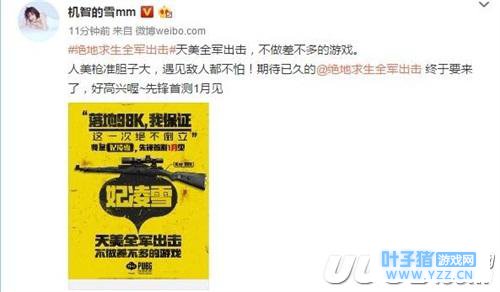 大吉大利,全军出击!腾讯与PUBG公司联合出品、天美工作室群担纲制作的《绝地求生》正版手游《绝地求生 全军出击》自曝光以来,受到了玩家的万众期待,首月全渠道玩家预约已然突破5000万。而官方公布“先锋测试1月见”的消息,更再次引爆玩家热情。 今日,MISS、小苍、JY、安静苦笑、妃凌雪、骚男和小野妹子学吐槽等人气博主一齐为《绝地求生 全军出击》呐喊打call,纷纷表示“首测一月见”,不知谁能成为幸运儿,真正感受《绝地求生 全军出击》的战术竞技魅力? 微博大V站台,《绝地求生 全军出击》首测即将开启 作为《绝地求生》正版授权手游,加以腾讯天美工作室群研发水准的强悍背书,《绝地求生 全军出击》在首测即将开启之际,便引来一众游戏圈的KOL在微博自发打CALL,为《绝地求生 全军出击》“不做差不多游戏”的诚意与态度点赞。 这其中,包括有“电竞女一号”之称的大小姐MISS。职业选手出身的她也是一名绝地求生玩家,经常在直播中游玩这款游戏,然而无奈有时状态不佳、枪法不济,被观众笑称为“人体描边大师”。此次为《绝地求生 全军出击》站台,她选出了自己最爱的枪械M416,宣称“满配M4已装备,描边模式已关闭”,不禁让人对她在正版手游中的表现拭目以待。