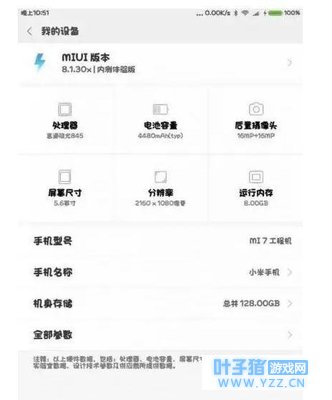 MIX 2s的渲染图 而最近网上又流出一张疑似小米7的工程机系统截图,图中显示小米 7的处理器为骁龙 845,屏幕为 1080p的 5.6寸屏,8GB内存和 1600W双摄。最为惊人的是 电池容量达到了4480 mAh!