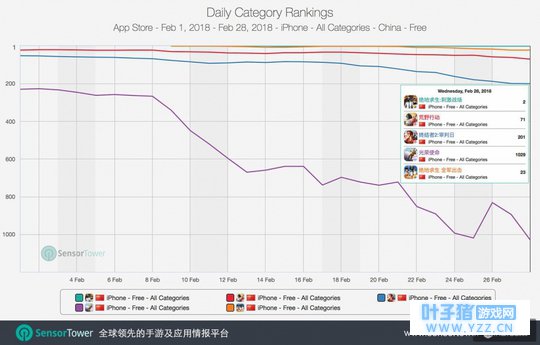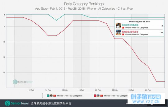 而《荒野行动》于同期从第32名下滑了39位,《终结者2》也自第85名下降到第201名。而这两部去年上线的吃鸡作品在《绝地求生》发布之前的排名走势有所下滑,但幅度在相比之下小得多。 下滑程度更加明显的是腾讯早期发布的另一款吃鸡作品《光荣使命》。从2月1日至8日,《光荣使命》于App Store商店单日下载排名在第231和268位之间。但《绝地求生》上线当天,《光荣使命》呈现更明显的持续下降趋势,目前排名在1029位。腾讯在上线《绝地求生》手游之后,或许减少了《光荣使命》的推广投入,将更多资源转移至两部正版吃鸡作品。 《刺激战场》对PUBG端游之还原度更佳,更受玩家热捧 在两款PUBG手游之间,赢家也尤为明显。以下对比图揭示了两部《绝地求生》上线近三周来,《刺激战场》领先优势明显,有更多新玩家在继续下载。而在《刺激战场》保持App Store上冠亚军位置的同时,《全军出击》在春节档一周便开始经历显著的排名下滑,与《刺激战场》来开距离。