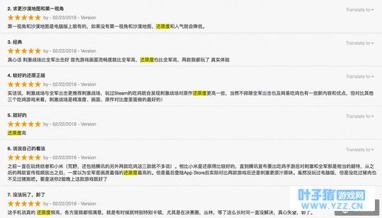 通过Sensor Tower的用户评论分析Review Analysis,我们监测到玩家在《刺激战场》iOS版中对《全军出击》进行了大量的比较点评。共超过6000条的评论中,“全军出击”与“比全军”为近2500条五星评论中提到最多的关键词,一共343条评论中都有提及《全军出击》,占比近14%。所有包含这两个关键词的评论共360条,总体评分也在4.5颗星以上。 同时,玩家们纷纷大力点赞《刺激战场》还原PUBG端游的真实程度,在144条评论中使用到了关键词“还原度”,总体评分达4.4颗星。