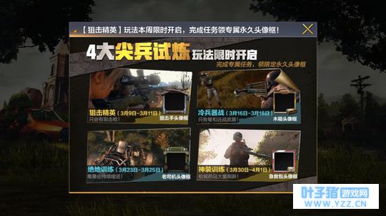 9日更新,惊喜不断。早有耳闻的新模式玩法,也终于曝出了,“狙击精英”、“冷兵器战”、“绝地训练”、“神装训练”四大模式将限时开放,玩家一旦完成不同模式的任务,即可获得相对应的限定头像框。同等装备下,更见玩家技巧!话不多说,首次开放的狙击精英,对于痴迷98K的迷妹来说,怎能错过?