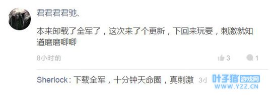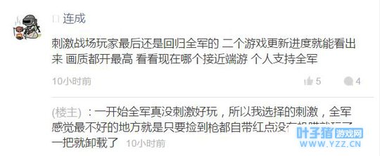 其实看到网友争论着实想笑,被游戏左右的人也是醉了,全军也好,刺激也罢甚至包括绝地求生端游,最重要的体验无非就是捡破烂的成就感、击败对手的荣誉感而已,弄得这个不更新就要玩那个,那个更新好了又重新装回去真的没有必要,来来回回卸载游戏你不累吗? |