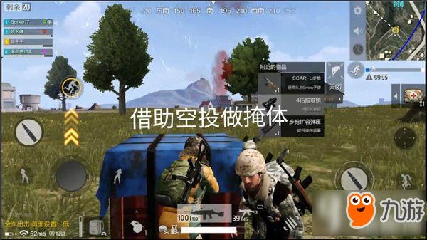 队友接应,撤离不愁 在多人组队游戏中,队友可以给危险的行动带来难以想象的帮助。 当两个队友驾驶载具捡空投的时候,其他队友需要占据制高点,观察附近的危险,一旦有隐藏的敌人对捡空投的战士进行攻击,占据制高点的战士就可以通过交流、枪声、射击预判来发现敌人的位置,从而火力压制敌人。这样受困的队友就可以通过载具快速离开危险的空投区域。