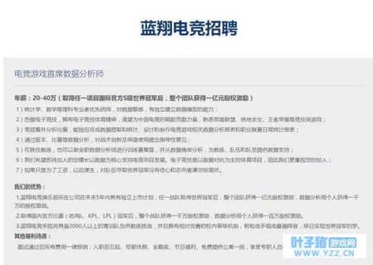 在蓝翔电竞俱乐部公开的招聘信息中,招聘岗位包括首席数据分析师、电竞俱乐部经理人、各大电竞项目教练、选手、电子竞技管理班班主任和电竞方向的心理咨询师,其中除了班主任外,其他职位取得任一项目国际官方S级世界冠军后,整个团队将获得一亿元股权激励。
