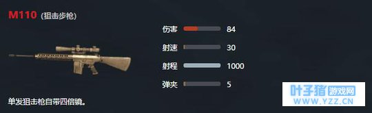 以上是AWM的伤害图,不过AWM有一个重大的缺点,那就是后坐力极高,这把枪好玩,但是好玩的同时也考验着玩家技术。 再来看M110的伤害图 伤害+84、射速+30、射程+1000、装弹数+5