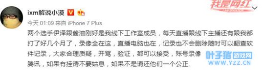 而小漠则表示伊泽和酱油两人都是他底下工作室的成员,跟他们一起打了好几个月了,录像全都有,可以随时查看不会删除,希望大家合理质疑的同时也理性判断,如果有挂请不要姑息,如果不是请还他们一个公正。