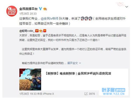 一直提倡外挂零容忍的全民TV,之前全民TV的主播帝师曾经就因为卢本伟开挂锤过卢本伟,而蛇哥申请自证的时候也转发微博说全民绝地求生频道对外挂零容忍,如果自证失败一定会捶碎!