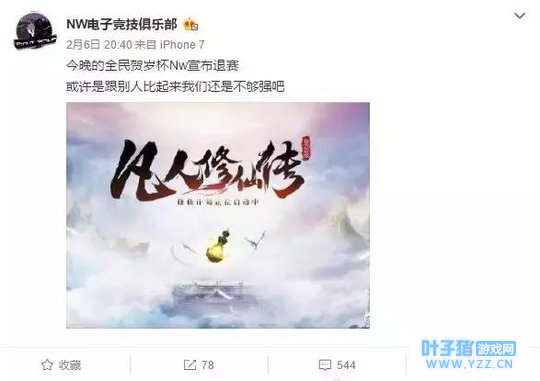 随后,NW战队还在微博中表示:“今晚的全民贺岁杯Nw宣布退赛,或许是跟别人比起来我们还是不够强吧”