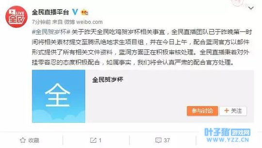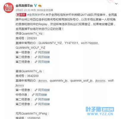 随后,全民TV还表示:“将公布四位选手的房间号和常用游戏账号ID,以及本场比赛第一人称视角的录像和游戏中的Replay,欢迎所有选手及粉丝们观看查证,如果有实锤证据,全民直播平台绝对会进行公证的处理!”