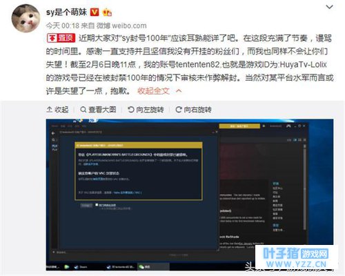经常看SY直播绝地求生的玩家都知道,他几天前突然被蓝洞官方封号,而且还是处罚最重的“封禁100年”,当时直播间就炸开了锅,很多网友怀疑他开了外挂。没想到今天凌晨剧情反转,经过蓝洞复审后判定,SY的账号tententen82并没有开挂,也就是ID为HuyaTv-Lolix的游戏号已经正式解封。